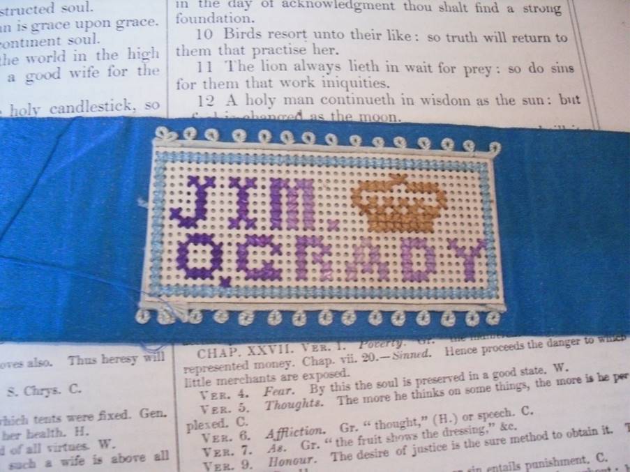 Image of an embroidery which says Jim O’Grady with a crown. In Irish culture the crown did not relate to the royal family, but to the idea of someone being celebrated. It sits within our family bible, and we did not know who it was for until recently.