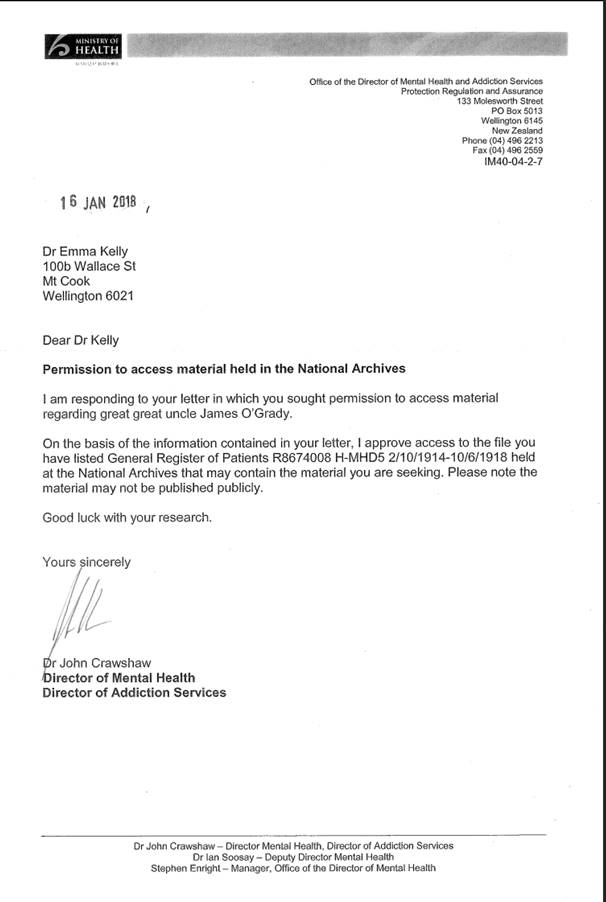 Letter from Dr John Crawshaw, Director of Mental Health, Director of Addiction Services, to Emma Kelly, granting permission for me to access my Great Great Uncle’s file listed General Register of Patients R8674008 H-MHD5 2/10/1914-10/6/1918 held at the National Archives.